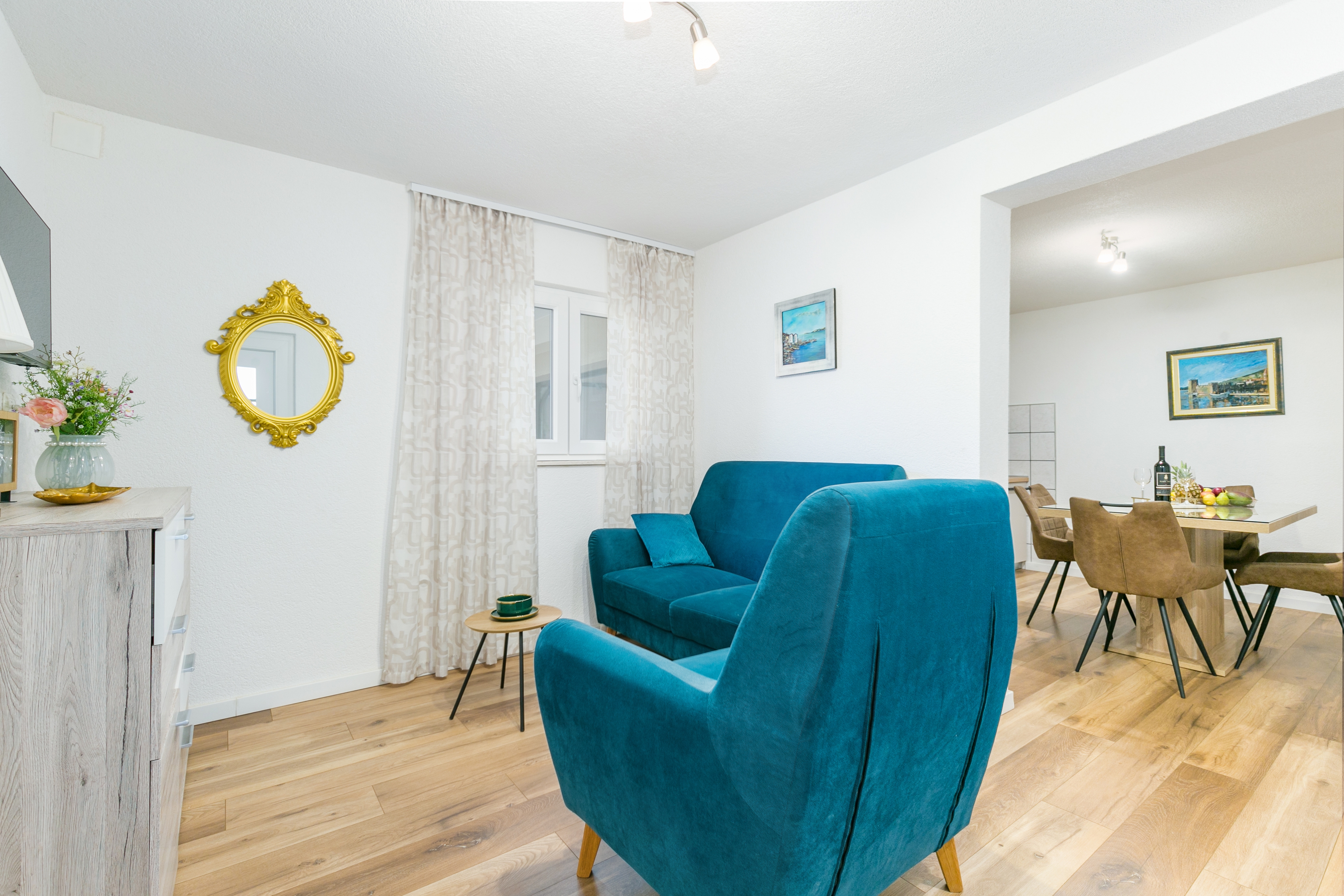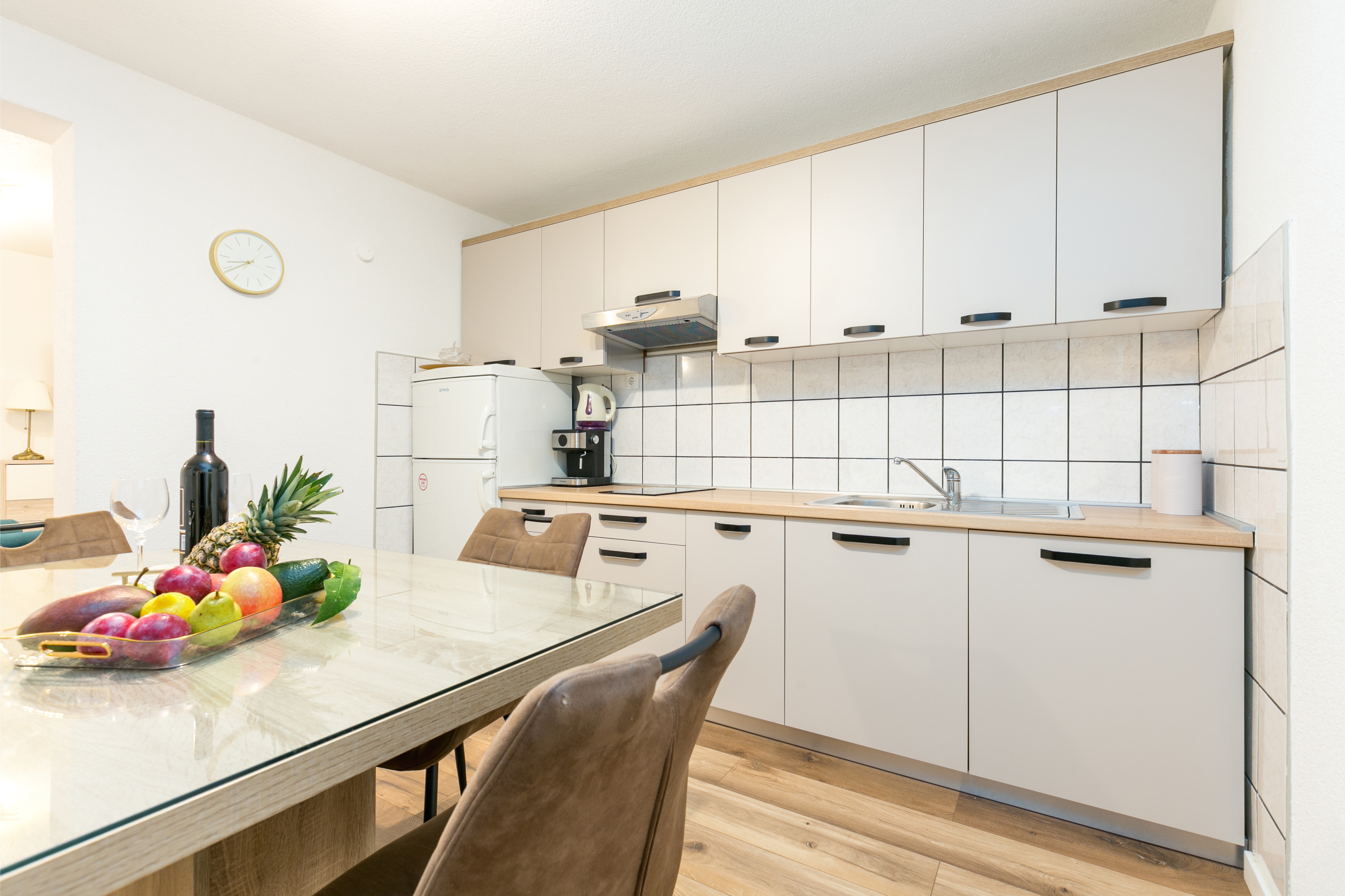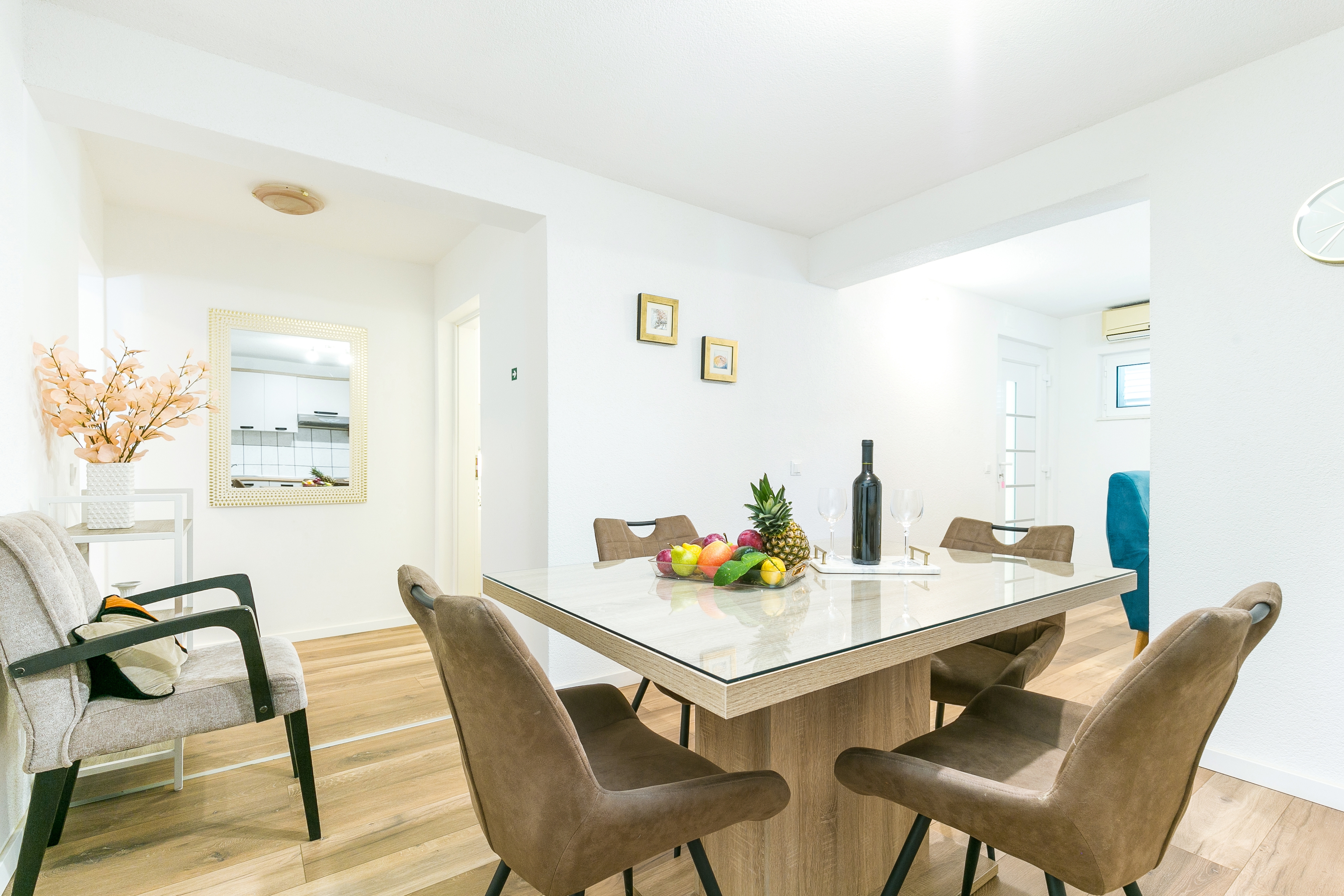 Apartament może przyjąć 5 gości. Łóżka znajdują się w sypialniach, których jest 2, na powierzchni 61m2. Goście mają dostęp do tarasu, by korzystać z ciepłych, letnich wieczorów. Możliwość przygotowywania posiłków poprzez korzystanie ze wspólnego grilla. WLICZONE W CENĘ: taksa pobytowa, sprzątanie końcowe, klimatyzacja, parking, internet, suszarka do włosów. OBOWIĄZKOWE KOSZTY DODATKOWE: dopłata za krótki termin (procent dopłaty w zalezności od liczby noclegów: 30% - 1, 20% - 2, 10% - 3). NIEOBOWIĄZKOWE KOSZTY DODATKOWE: miejsce do cumowania łodzi (10,00 € za nocleg). Dostępność dodatkowych usług w rezerwowanym terminie oraz ich cenę (jeśli nie jest podana) należy sprawdzić wcześniej. Za dodatowe usługi, które nie zostały uwzględnione w kalkulacji ceny, płaci się bezpośrednio właścicielowi obiektu, pod warunkiem śe gość korzysta z tych usług.