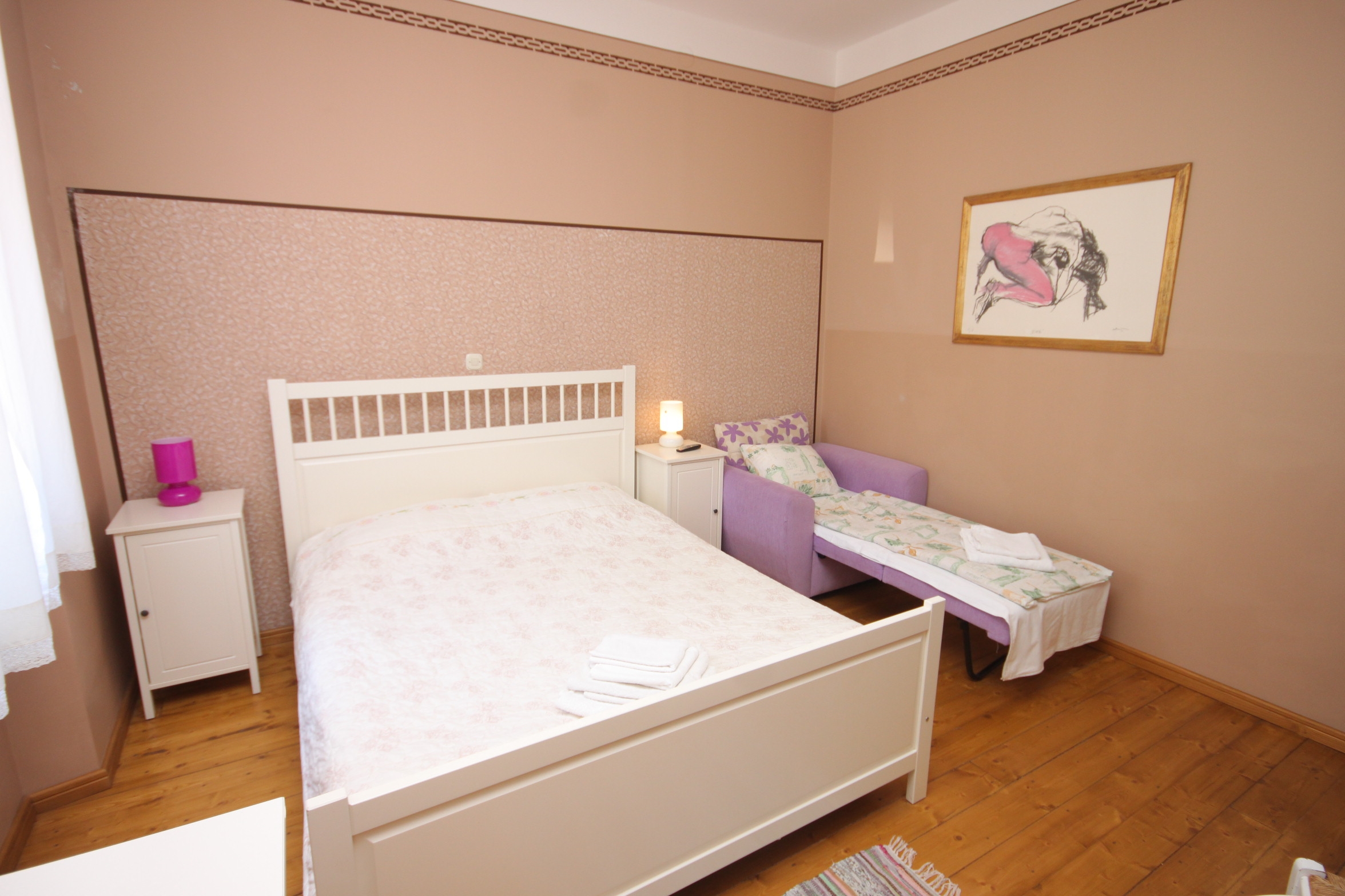 Pokój może przyjąć 3 gości. Łóżka znajdują się w sypialniach, których jest 1, na powierzchni 19m2. W kwaterze dozwolony jest pobyt zwierzęcia domowego, za dopłatą. Rezerwowana kwatera nie ma balkonu ani tarasu. Rezerwowana kwatera to pokój z własną łazienką, bez możliwości korzystania z kuchni. WLICZONE W CENĘ: śniadanie, sprzątanie końcowe, parking, internet, pranie bielizny, łóżeczko dziecięce. OBOWIĄZKOWE KOSZTY DODATKOWE: taksa pobytowa (dorośli 0,93 € - 1,80 € noclegosoba, zniżka dla dzieci w wieku 12 - 17 lat). NIEOBOWIĄZKOWE KOSZTY DODATKOWE: śniadanie i kolacja (20,00 €, 50% zniżki dla dzieci od 4 do 12 lat, Bezpłatne dla dzieci do 4 lat), zwierzęta domowe (10,00 € za nocleg). Dostępność dodatkowych usług w rezerwowanym terminie oraz ich cenę (jeśli nie jest podana) należy sprawdzić wcześniej. Za dodatowe usługi, które nie zostały uwzględnione w kalkulacji ceny, płaci się bezpośrednio właścicielowi obiektu, pod warunkiem śe gość korzysta z tych usług. Zniżki od ceny podstawowej: bezpłatny dzień 14=13 (przy pobycie, trwającym co najmniej 14 dni, otrzymujecie jeden bezpłatny dzień na pobyt do 31.12.2026).