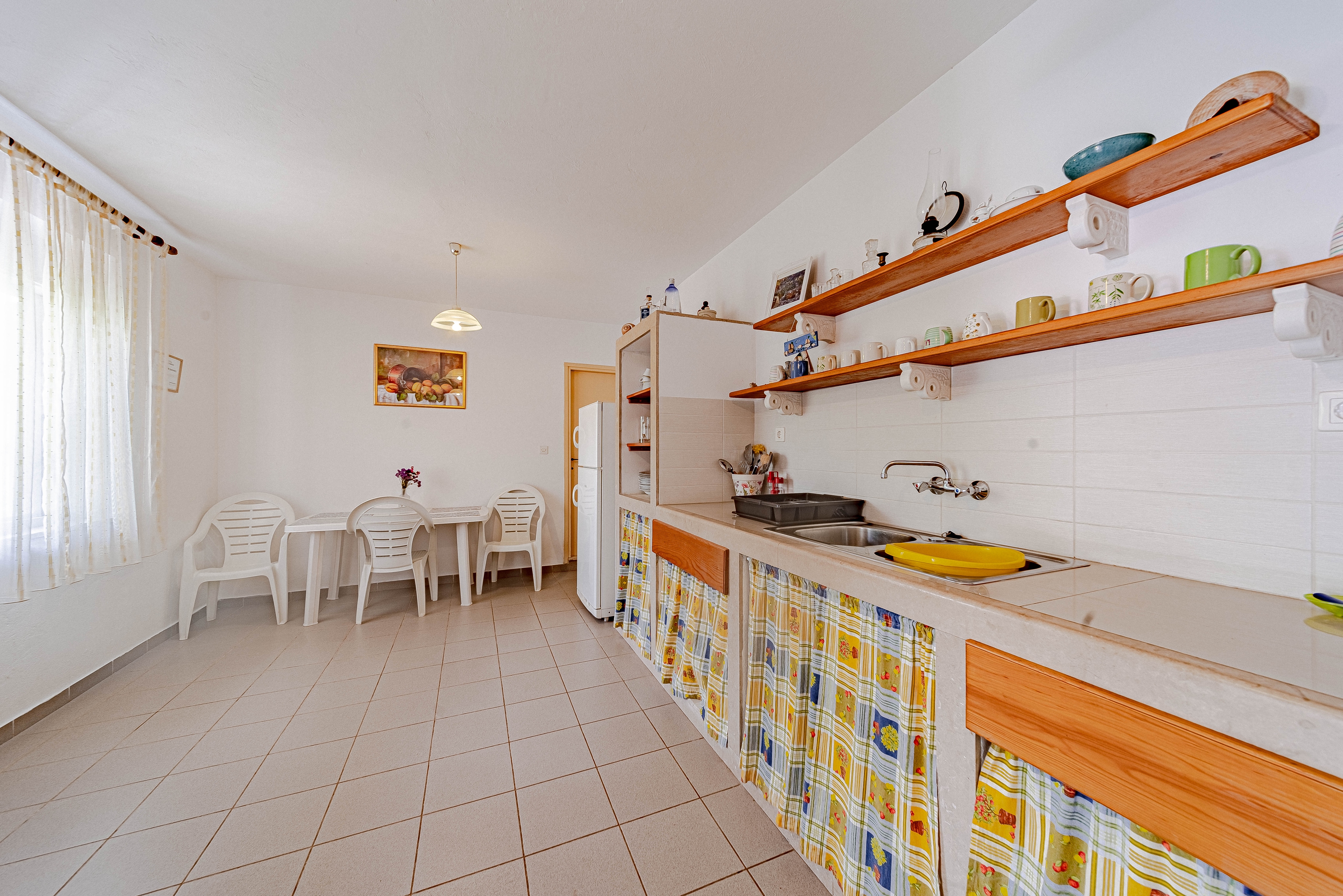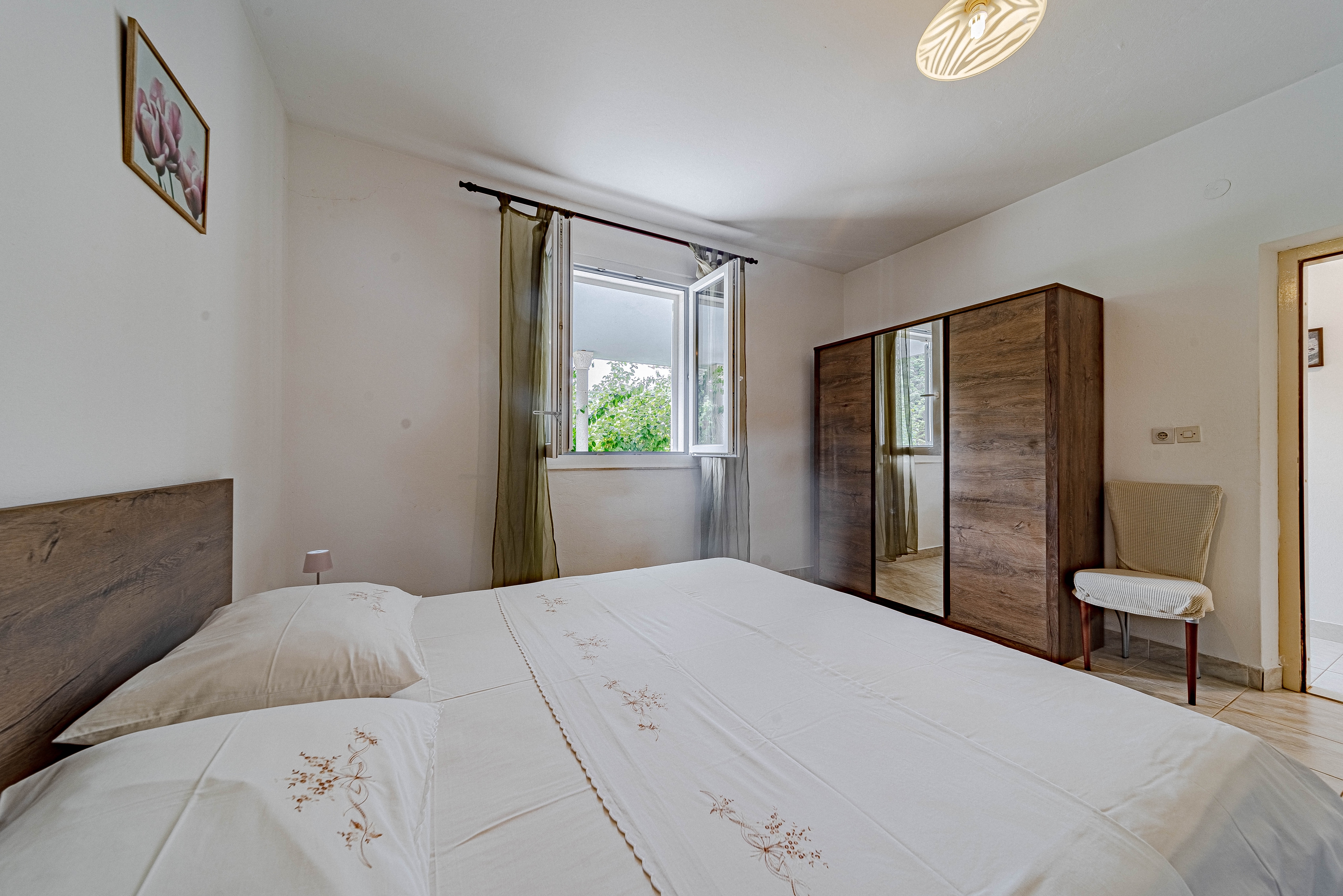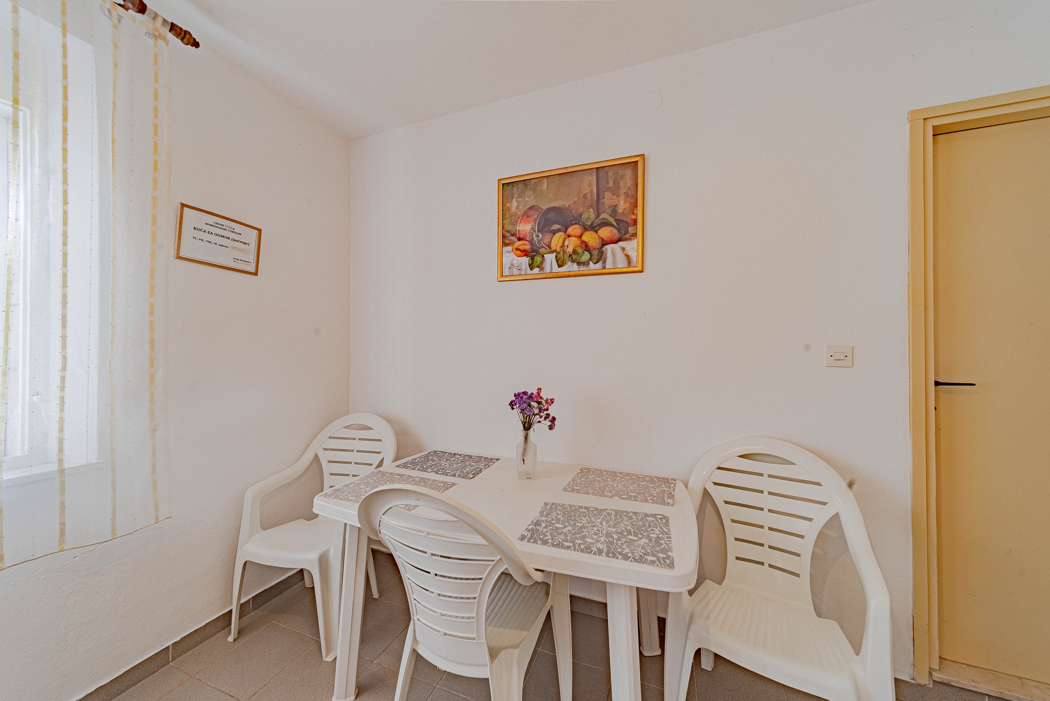 Dom może przyjąć 9 gości. Łóżka znajdują się w sypialniach, których jest 4, na powierzchni 85m2. Goście mają dostęp do tarasu, by korzystać z ciepłych, letnich wieczorów. Z domu wakacyjnego roztacza się widok na morze. Grill jest dostępny tylko do użytku gości z tej kwatery. WLICZONE W CENĘ: taksa pobytowa, sprzątanie końcowe, parking, miejsce do cumowania łodzi, leżaki. OBOWIĄZKOWE KOSZTY DODATKOWE: dopłata za krótki termin (procent dopłaty w zalezności od liczby noclegów: 30% - 1, 20% - 2, 10% - 3). Dostępność dodatkowych usług w rezerwowanym terminie oraz ich cenę (jeśli nie jest podana) należy sprawdzić wcześniej. Za dodatowe usługi, które nie zostały uwzględnione w kalkulacji ceny, płaci się bezpośrednio właścicielowi obiektu, pod warunkiem śe gość korzysta z tych usług.