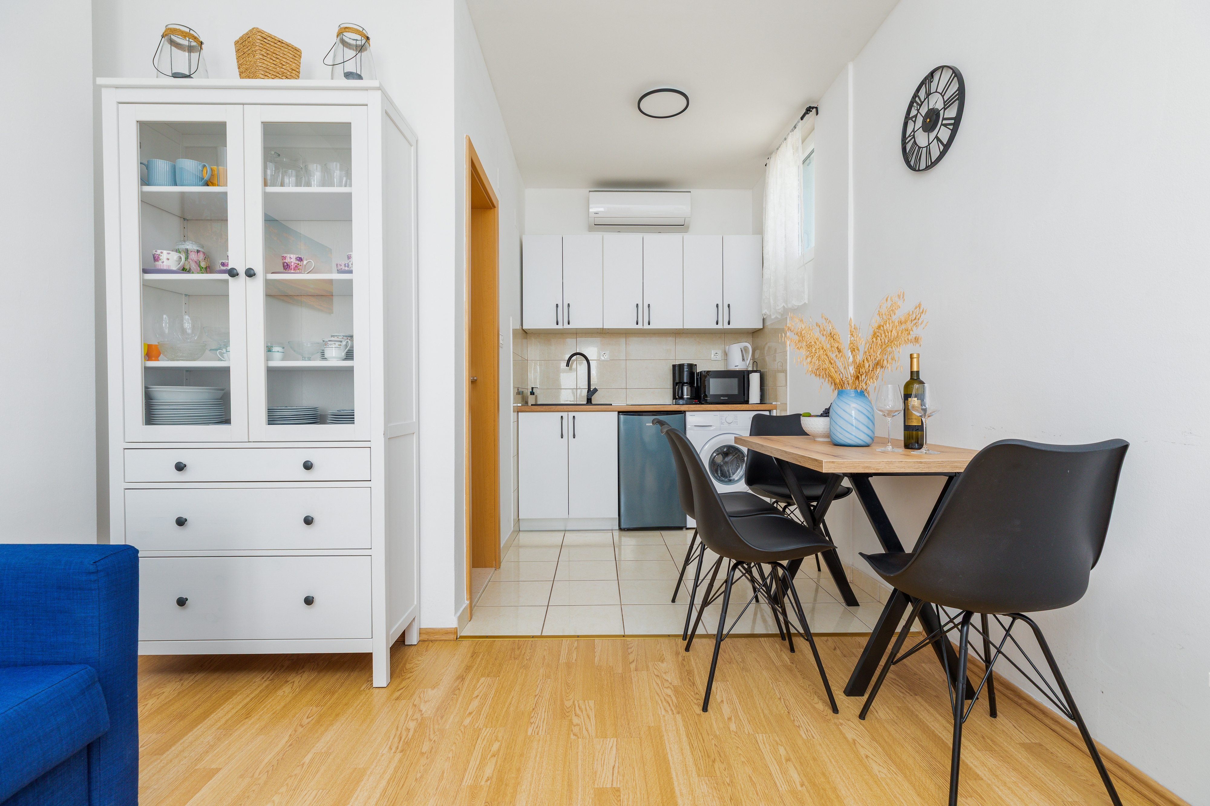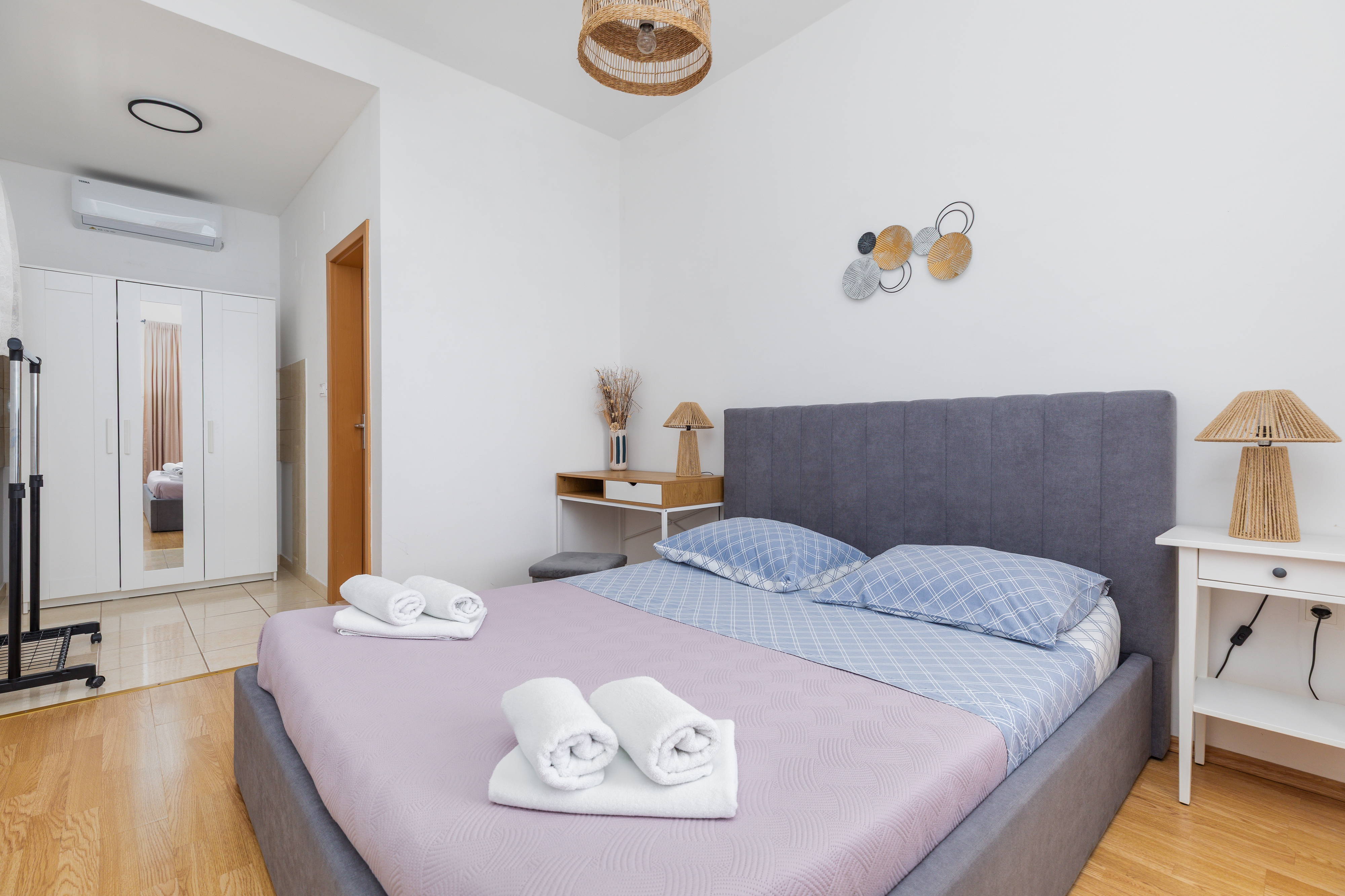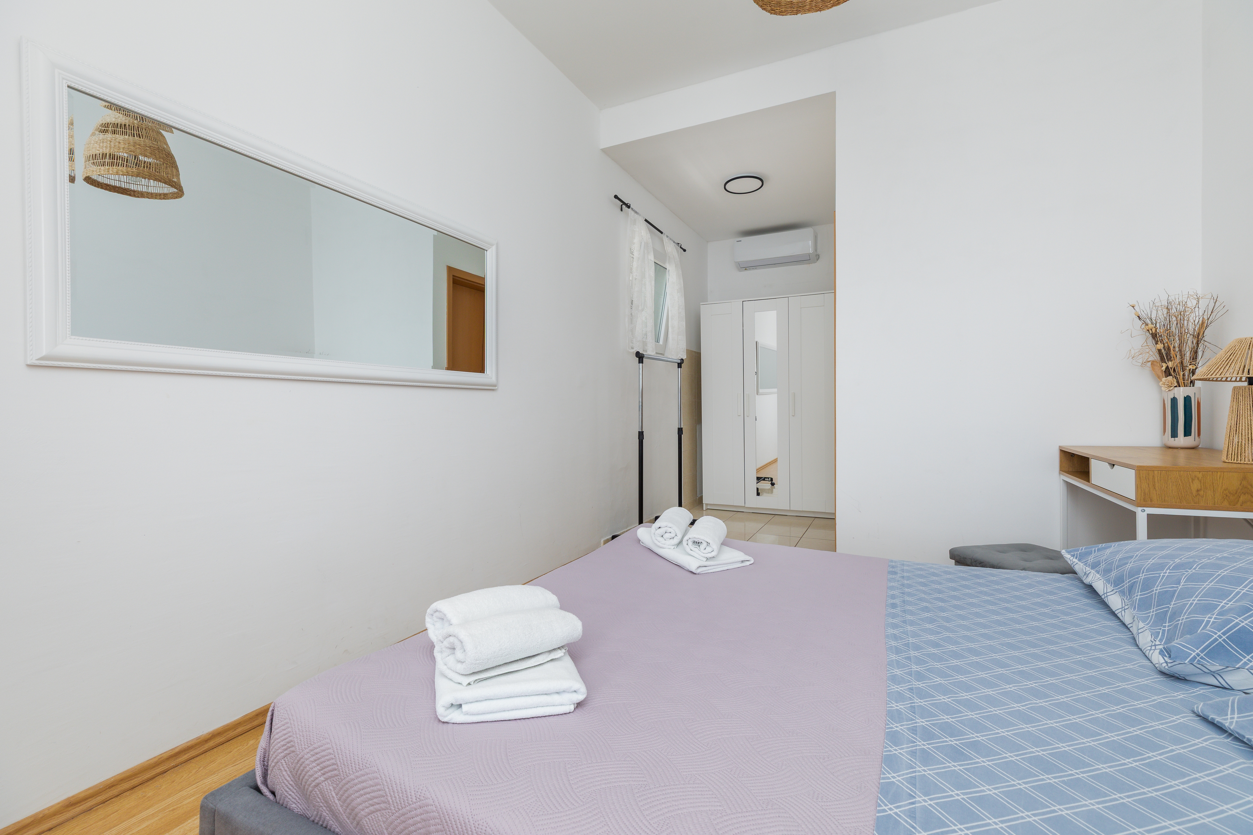 Apartament może przyjąć 4 gości. Łóżka znajdują się w sypialniach, których jest 1, oraz w pokoju dziennym, na powierzchni 42m2. Goście mają dostęp do tarasu, by korzystać z ciepłych, letnich wieczorów. Z apartamentu roztacza się widok na morze. Pomieszczenia rezerwowanej kwatery nie są połączone w jedną całość. Kwatera ma pomieszczenia, które są oddzielone od reszty tej kwatery. WLICZONE W CENĘ: taksa pobytowa, sprzątanie końcowe, klimatyzacja, parking, internet, łóżeczko dziecięce, żelazko, suszarka do włosów. Dostępność dodatkowych usług w rezerwowanym terminie oraz ich cenę (jeśli nie jest podana) należy sprawdzić wcześniej. Za dodatowe usługi, które nie zostały uwzględnione w kalkulacji ceny, płaci się bezpośrednio właścicielowi obiektu, pod warunkiem śe gość korzysta z tych usług.