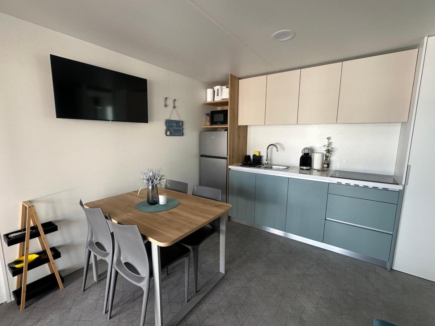 Domek holenderski. This air-conditioned mobile home consists of 1 living room, 2 separate bedrooms and 2 bathrooms with a shower. The fully equipped kitchen features a stovetop, a refrigerator, kitchenware and a microwave. Featuring a terrace with sea views, this mobile home also provides a coffee machine and a flat-screen TV. The unit offers 4 beds. Domek holenderski - 6 osobowy. Powierzchnia pokoju ok.: 34 mkw. ;