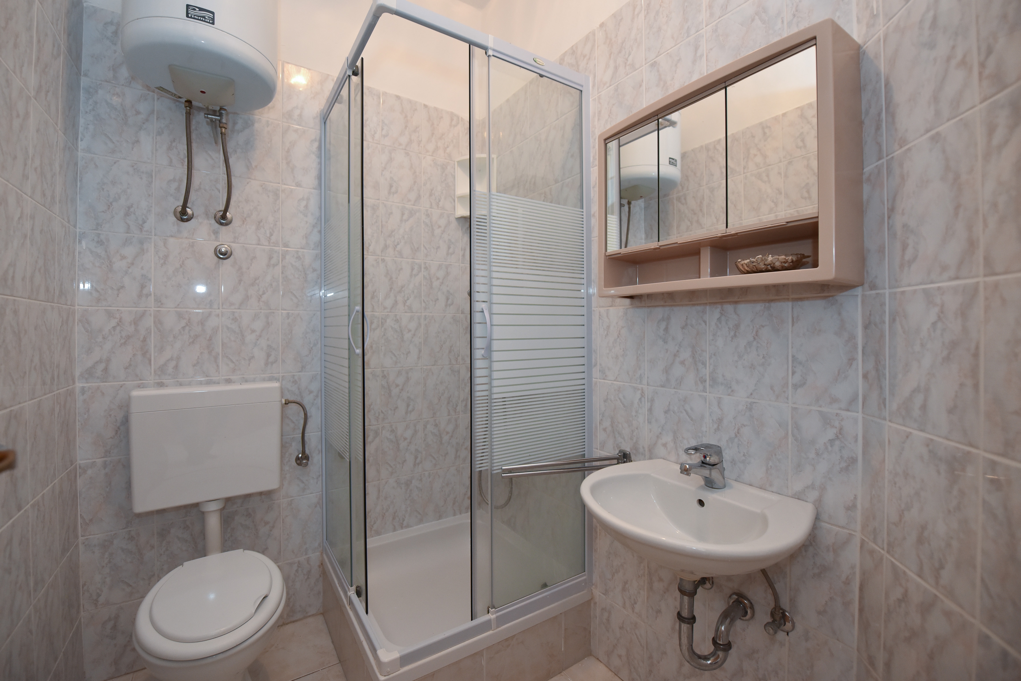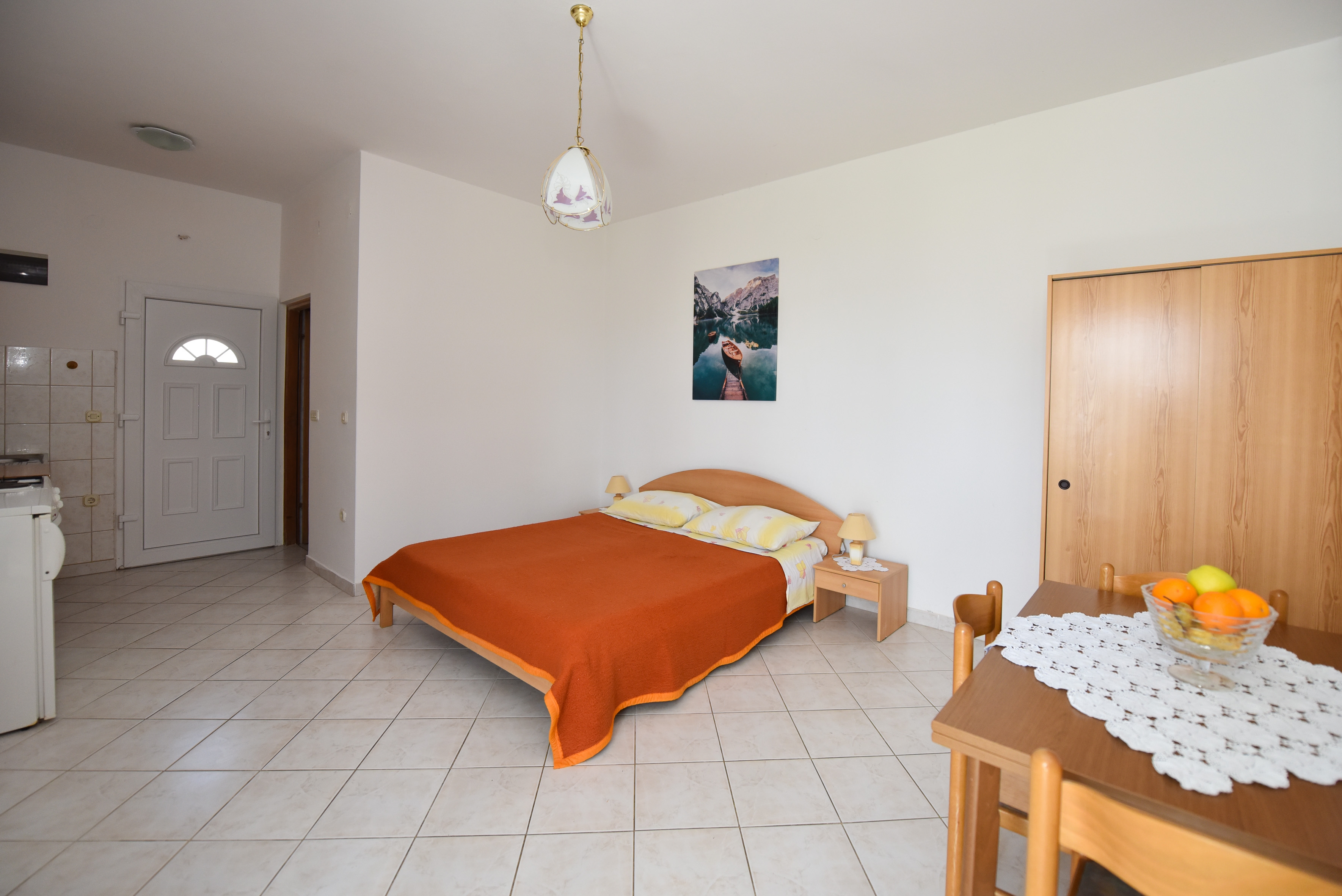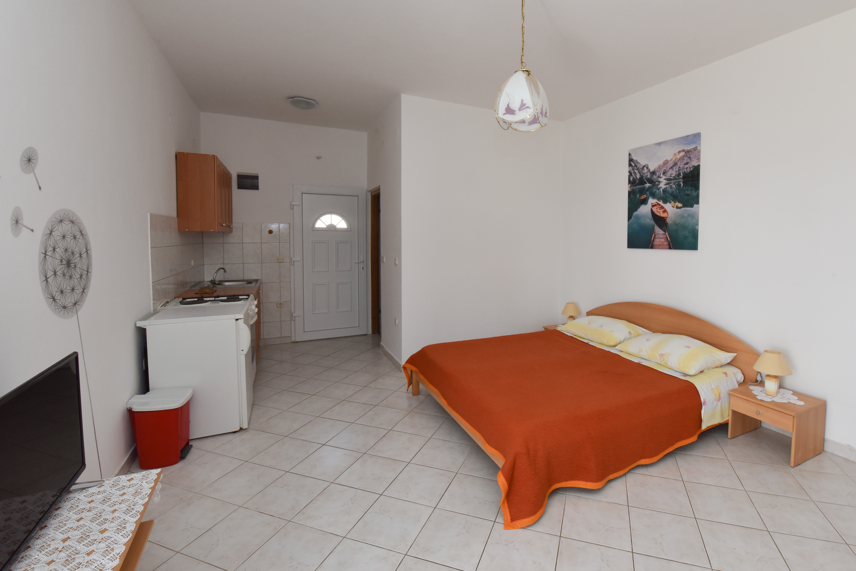 Studio może przyjąć 2 gości. Łóżka znajdują się w sypialniach, których jest 1, na powierzchni 26m2. Goście mają dostęp do tarasu, by korzystać z ciepłych, letnich wieczorów. Z apartamentu typu studio roztacza się widok na morze. Możliwość przygotowywania posiłków poprzez korzystanie ze wspólnego grilla. W kwaterze dozwolony jest pobyt zwierzęcia domowego, za dopłatą. WLICZONE W CENĘ: sprzątanie końcowe, klimatyzacja, parking, internet, miejsce do cumowania łodzi, żelazko, deska do prasowania, suszarka do włosów. OBOWIĄZKOWE KOSZTY DODATKOWE: taksa pobytowa (dorośli 0,93 € - 1,60 € noclegosoba, zniżka dla dzieci w wieku 12 - 17 lat), dopłata za krótki termin (procent dopłaty w zalezności od liczby noclegów: 30% - 1, 20% - 2, 10% - 3). NIEOBOWIĄZKOWE KOSZTY DODATKOWE: pranie bielizny (5,00 € pranie), zwierzęta domowe (5,00 € za nocleg), dostawka (5,00 € za nocleg). Dostępność dodatkowych usług w rezerwowanym terminie oraz ich cenę (jeśli nie jest podana) należy sprawdzić wcześniej. Za dodatowe usługi, które nie zostały uwzględnione w kalkulacji ceny, płaci się bezpośrednio właścicielowi obiektu, pod warunkiem śe gość korzysta z tych usług.