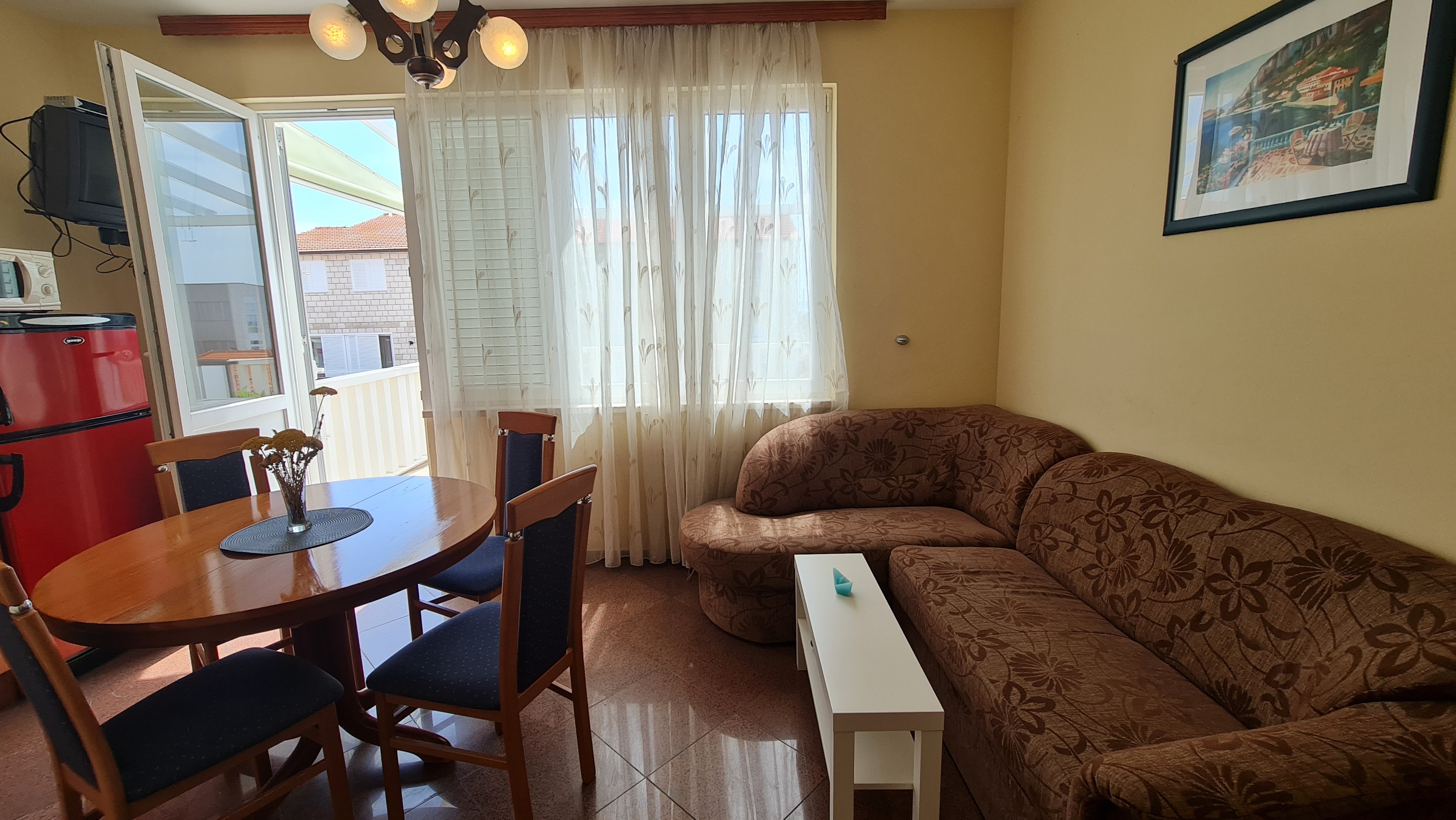 Apartament może przyjąć 4 gości. Łóżka znajdują się w sypialniach, których jest 1, oraz w pokoju dziennym, na powierzchni 30m2. Goście mają dostęp do tarasu, by korzystać z ciepłych, letnich wieczorów. Z apartamentu roztacza się widok na morze. Możliwość przygotowywania posiłków poprzez korzystanie ze wspólnego grilla. WLICZONE W CENĘ: taksa pobytowa, sprzątanie końcowe, klimatyzacja, parking, internet, żelazko, suszarka do włosów. OBOWIĄZKOWE KOSZTY DODATKOWE: dopłata za krótki termin (procent dopłaty w zalezności od liczby noclegów: 30% - 1, 20% - 2, 10% - 3). Dostępność dodatkowych usług w rezerwowanym terminie oraz ich cenę (jeśli nie jest podana) należy sprawdzić wcześniej. Za dodatowe usługi, które nie zostały uwzględnione w kalkulacji ceny, płaci się bezpośrednio właścicielowi obiektu, pod warunkiem śe gość korzysta z tych usług.