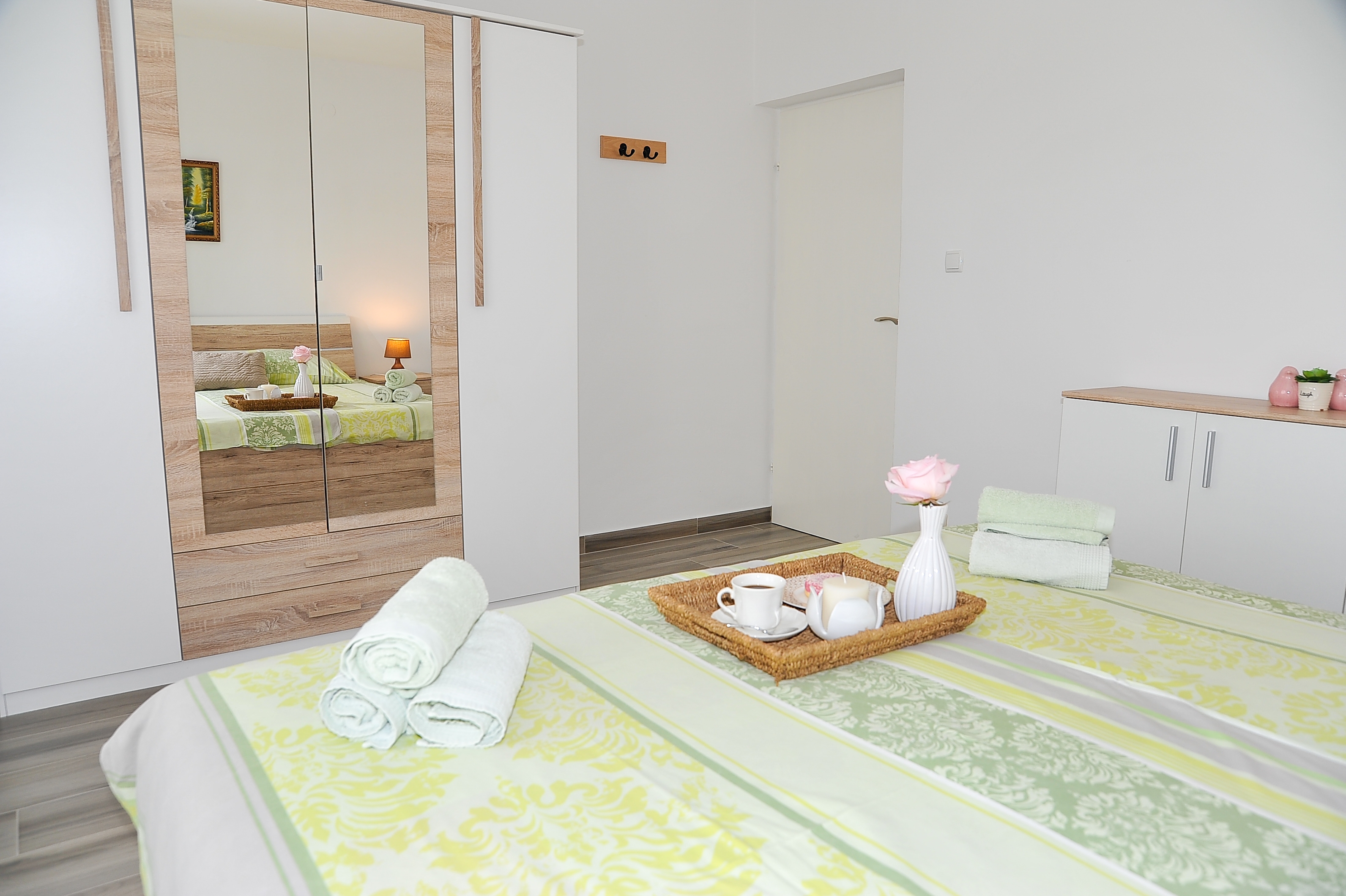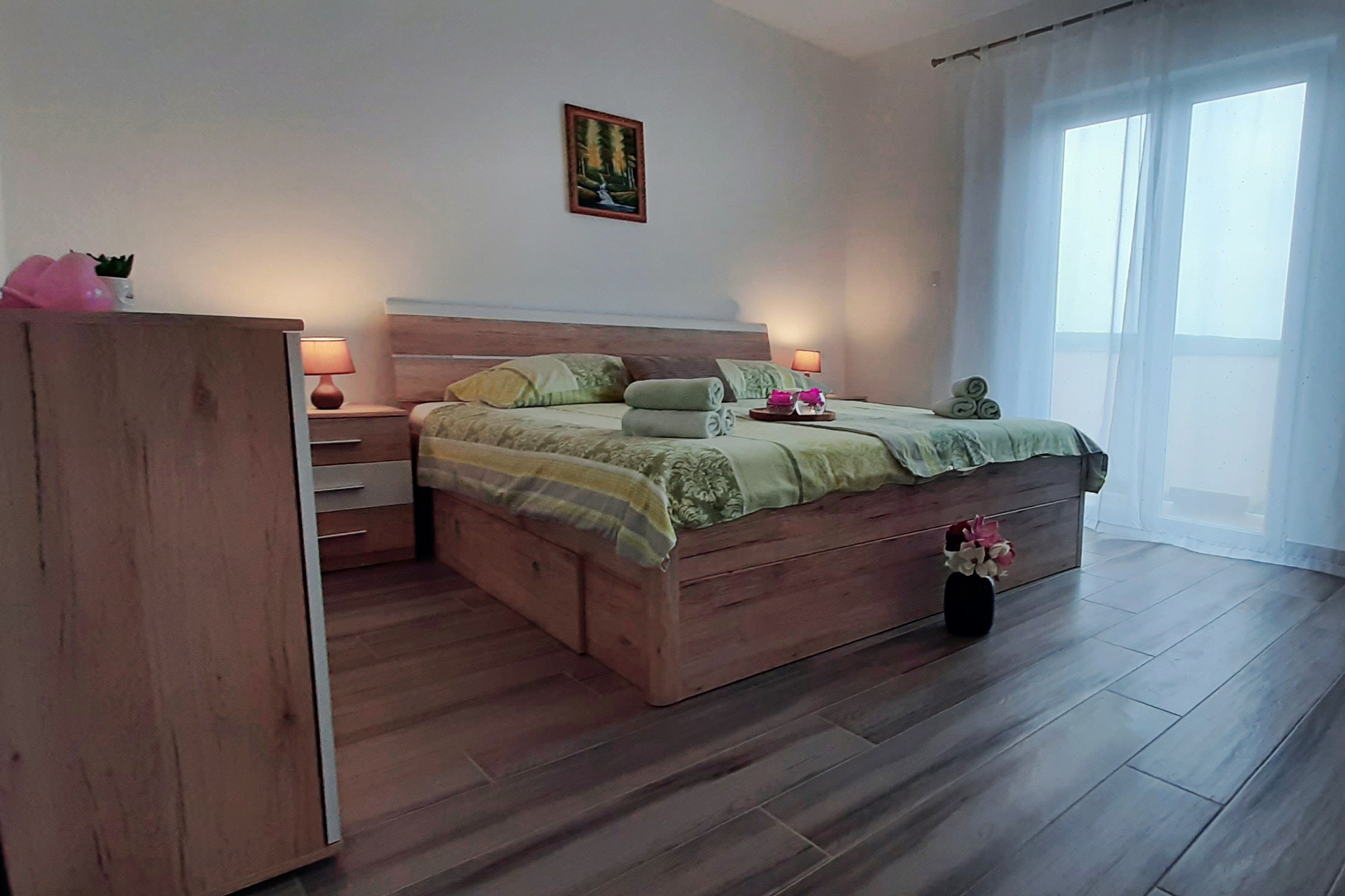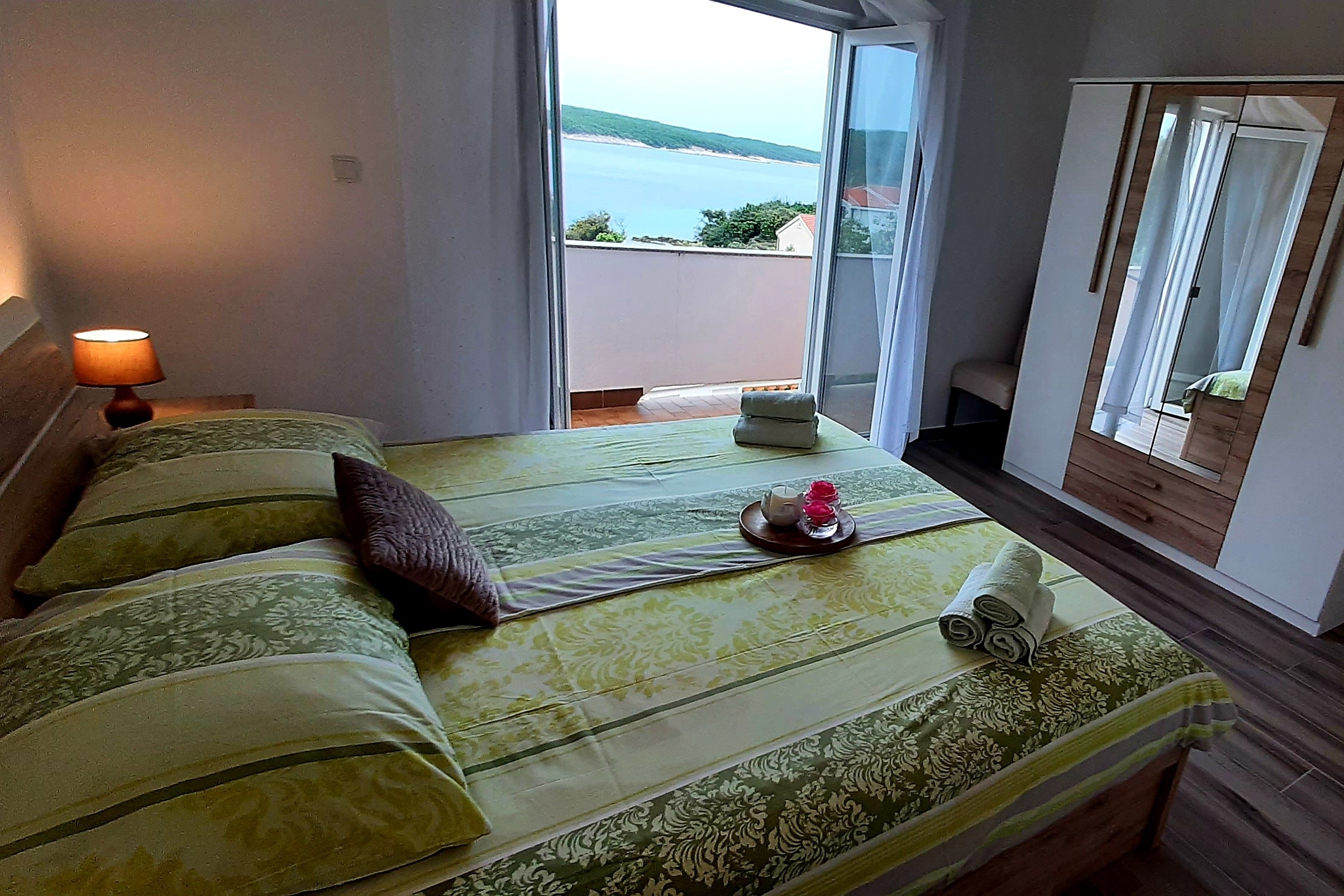 Apartament może przyjąć 4 gości. Łóżka znajdują się w sypialniach, których jest 2, na powierzchni 57m2. Goście mają dostęp do tarasu, by korzystać z ciepłych, letnich wieczorów. Z apartamentu roztacza się widok na morze. Możliwość przygotowywania posiłków poprzez korzystanie ze wspólnego grilla. W kwaterze dozwolony jest pobyt zwierzęcia domowego, za dopłatą. WLICZONE W CENĘ: taksa pobytowa, sprzątanie końcowe, klimatyzacja, parking, internet, miejsce do cumowania łodzi, łóżeczko dziecięce, suszarka do włosów. NIEOBOWIĄZKOWE KOSZTY DODATKOWE: zwierzęta domowe (10,00 € za nocleg). Dostępność dodatkowych usług w rezerwowanym terminie oraz ich cenę (jeśli nie jest podana) należy sprawdzić wcześniej. Za dodatowe usługi, które nie zostały uwzględnione w kalkulacji ceny, płaci się bezpośrednio właścicielowi obiektu, pod warunkiem śe gość korzysta z tych usług.