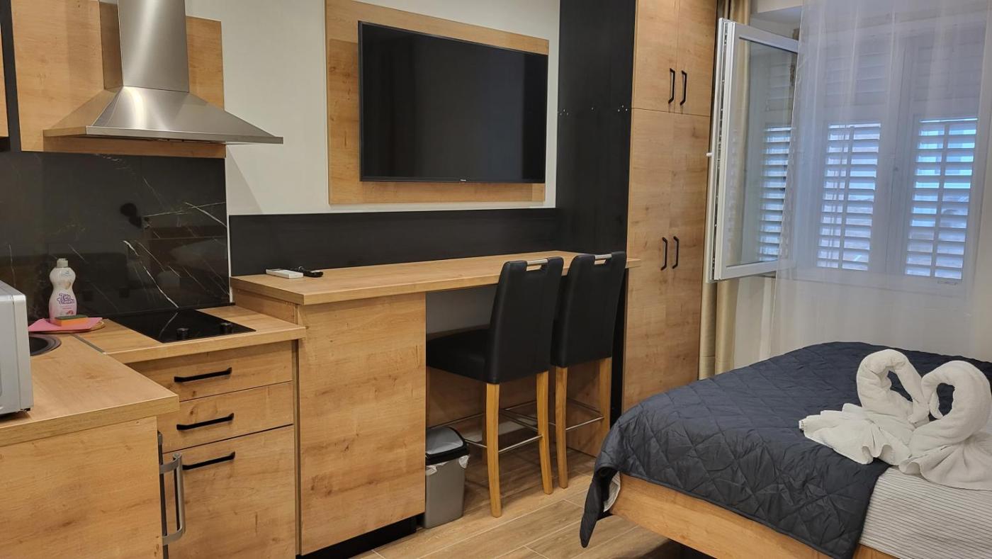 Studio typu Deluxe z łóżkiem typu king-size. Offering free toiletries, this studio includes a private bathroom with a walk-in shower and a hairdryer. In the kitchen, guests will find a stovetop, a refrigerator, kitchenware and a microwave. The air-conditioned studio offers a flat-screen TV with streaming services, a washing machine, a private entrance, a wardrobe as well as ancourtyard view. The unit has 3 beds. Studio - 2 osobowy. Powierzchnia pokoju ok.: 20 mkw.