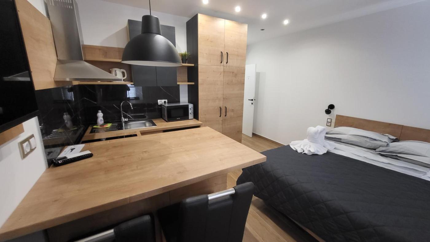 Studio typu Deluxe z łóżkiem typu king-size. Providing free toiletries, this studio includes a private bathroom with a walk-in shower and a hairdryer. The well-fitted kitchen features a stovetop, a refrigerator, kitchenware and a microwave. The air-conditioned studio provides a flat-screen TV with streaming services, a washing machine, a private entrance, a wardrobe as well as ancourtyard view. Studio - 2 osobowy. Powierzchnia pokoju ok.: 20 mkw. ;