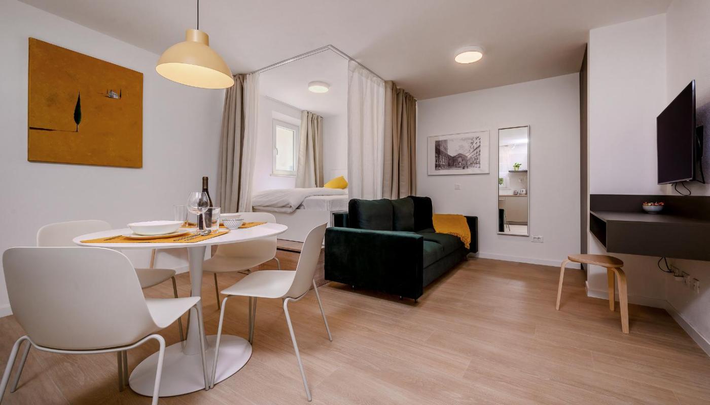 Studio typu Deluxe z łóżkiem typu queen-size. The studio features a seating area, a dining area, as well as a private bathroom featuring a shower and a hairdryer. In the well-fitted kitchen, guests will find a stovetop, a refrigerator, a dishwasher and kitchenware. The air-conditioned studio provides a flat-screen TV with streaming services, a washing machine, a private entrance, a tea and coffee maker as well as a quiet street view. The unit offers 1 bed. Studio - 2 osobowy. Powierzchnia pokoju ok.: 34 mkw.