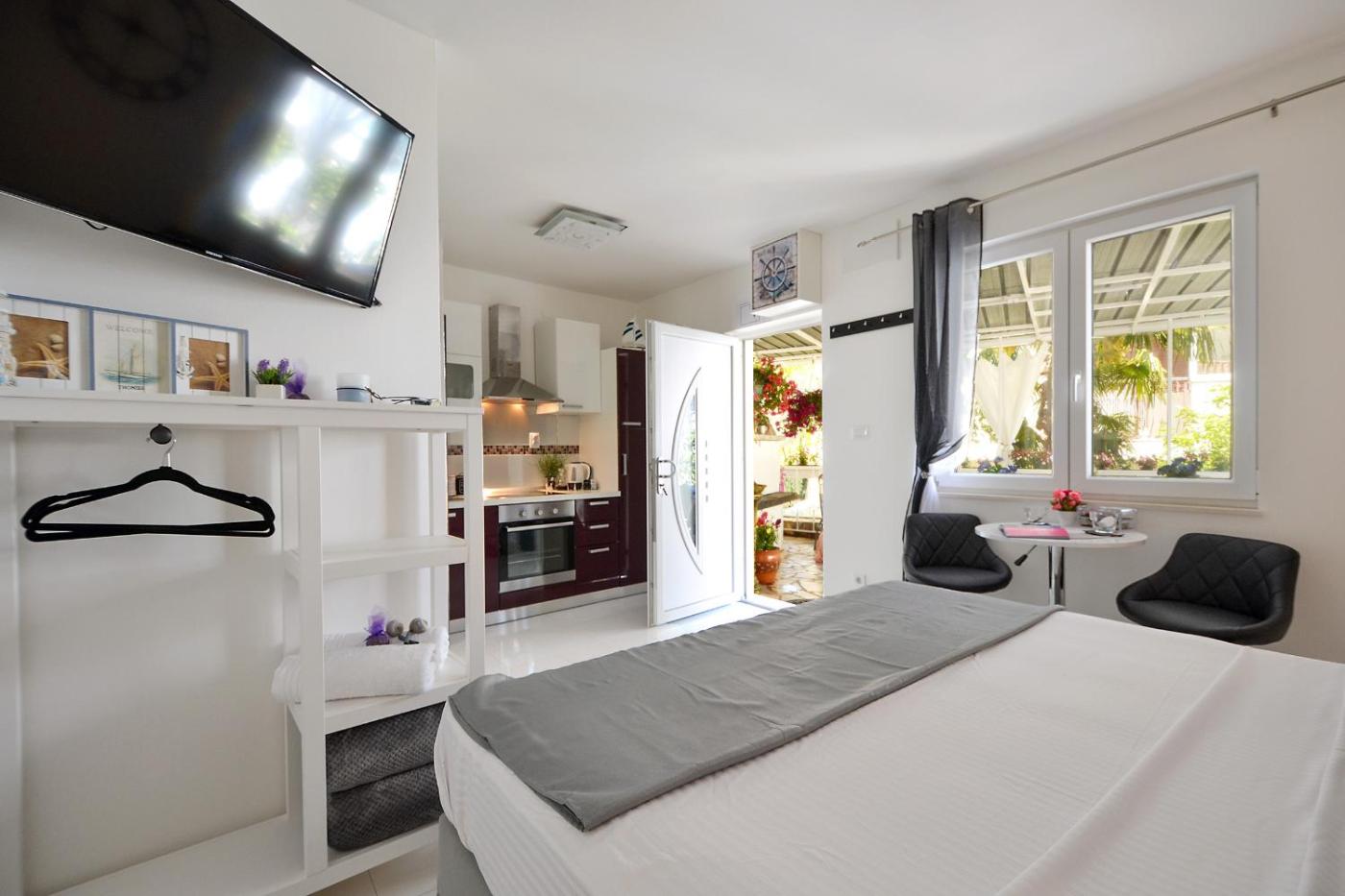 Apartament typu studio. Boasting a private entrance, this air-conditioned apartment features a kitchen, 1 bedroom and 1 bathroom with a shower and a hairdryer. Guests will find a stovetop, a refrigerator, a dishwasher and kitchenware in the well-fitted kitchen. The apartment also comes with a barbecue. Featuring a terrace with garden views, this apartment also features a washing machine and a flat-screen TV with cable channels. The unit has 1 bed. Apartament - 2 osobowy. Powierzchnia pokoju ok.: 20 mkw.