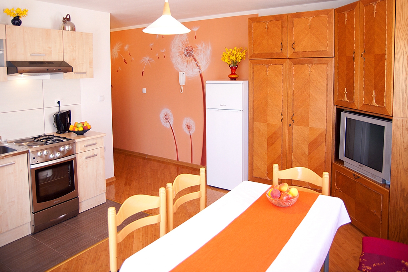 Apartament może przyjąć 7 gości. Łóżka znajdują się w sypialniach, których jest 2, oraz w pokoju dziennym, na powierzchni 55m2. Goście mają dostęp do tarasu, by korzystać z ciepłych, letnich wieczorów. Do kwatery można przyjechać ze zwierzęciem domowym, a usługa jest wliczona w cenę wynajęcia kwatery. WLICZONE W CENĘ: taksa pobytowa, sprzątanie końcowe, klimatyzacja, parking, internet, zwierzęta domowe, łóżeczko dziecięce, suszarka do włosów. Dostępność dodatkowych usług w rezerwowanym terminie oraz ich cenę (jeśli nie jest podana) należy sprawdzić wcześniej. Za dodatowe usługi, które nie zostały uwzględnione w kalkulacji ceny, płaci się bezpośrednio właścicielowi obiektu, pod warunkiem śe gość korzysta z tych usług. Zniżki od ceny podstawowej: bezpłatny dzień 21=19 (przy pobycie, trwającym co najmniej 21 dni, trzymujecie dwa bezpłatne dni na pobyt do 31.12.2026).