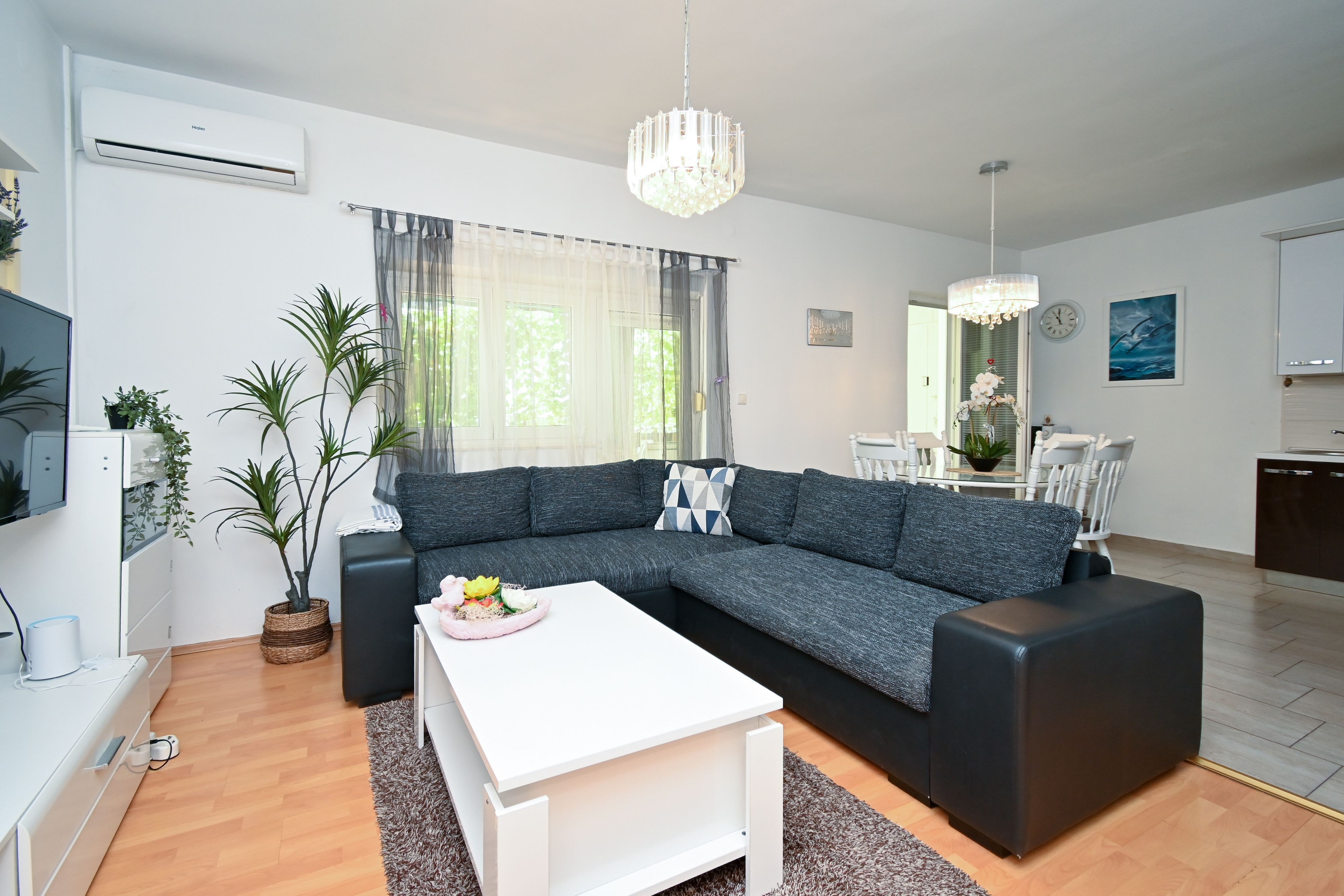 Apartament może przyjąć 5 gości. Łóżka znajdują się w sypialniach, których jest 2, na powierzchni 70m2. Goście mają dostęp do tarasu, by korzystać z ciepłych, letnich wieczorów. Możliwość przygotowywania posiłków poprzez korzystanie ze wspólnego grilla. WLICZONE W CENĘ: taksa pobytowa, sprzątanie końcowe, klimatyzacja, parking, internet, łóżeczko dziecięce, żelazko, suszarka do włosów. Dostępność dodatkowych usług w rezerwowanym terminie oraz ich cenę (jeśli nie jest podana) należy sprawdzić wcześniej. Za dodatowe usługi, które nie zostały uwzględnione w kalkulacji ceny, płaci się bezpośrednio właścicielowi obiektu, pod warunkiem śe gość korzysta z tych usług. Zniżki od ceny podstawowej: bezpłatny dzień 14=13 (przy pobycie, trwającym co najmniej 14 dni, otrzymujecie jeden bezpłatny dzień na pobyt do 31.12.2026).
